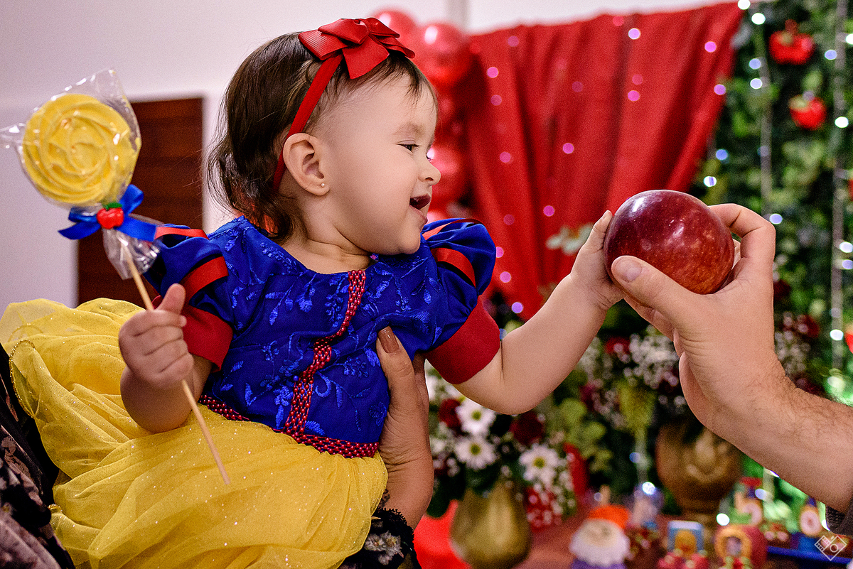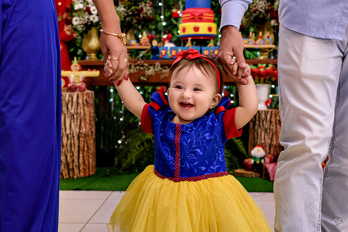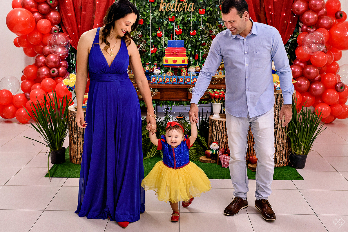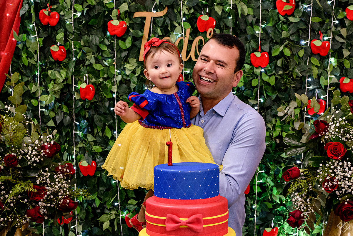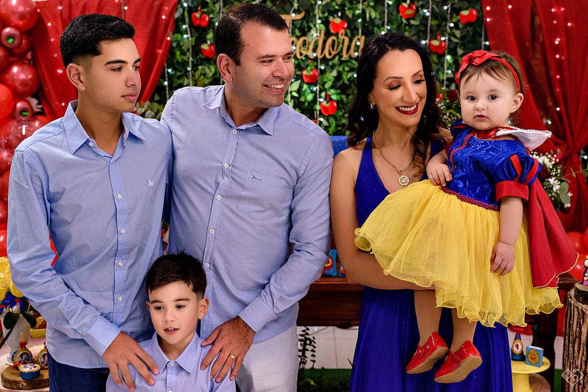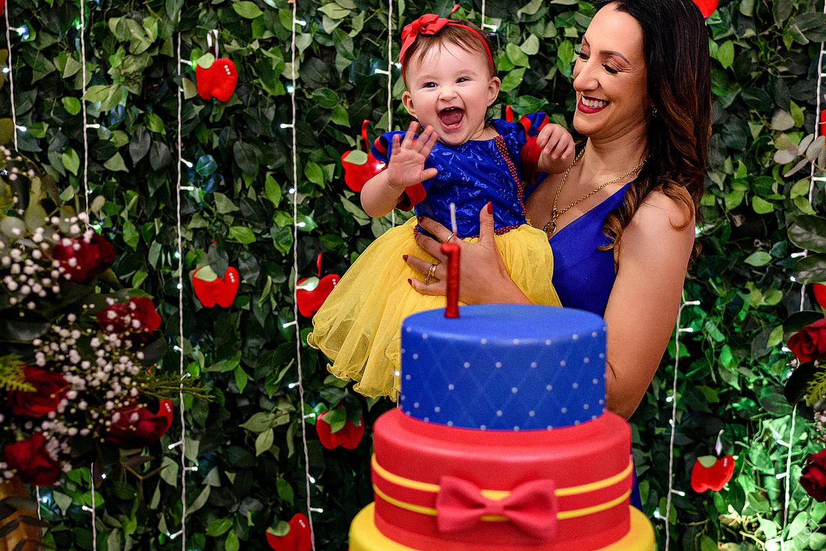 Mas aqui estamos para falar deste primeiro aninho, que festa linda onde a Teodora parecia mais uma princesa vinda dum conto de fadas, aliás, foi com o tema da princesa Branca de Neve que a festa foi pensada e planejada pela mamãe Andrea. Teodora estava feliz, riu e brincou, tirou foto com todos os convidados e sempre abrindo aquele sorriso quando o papai chamava de "linda e perfeita".