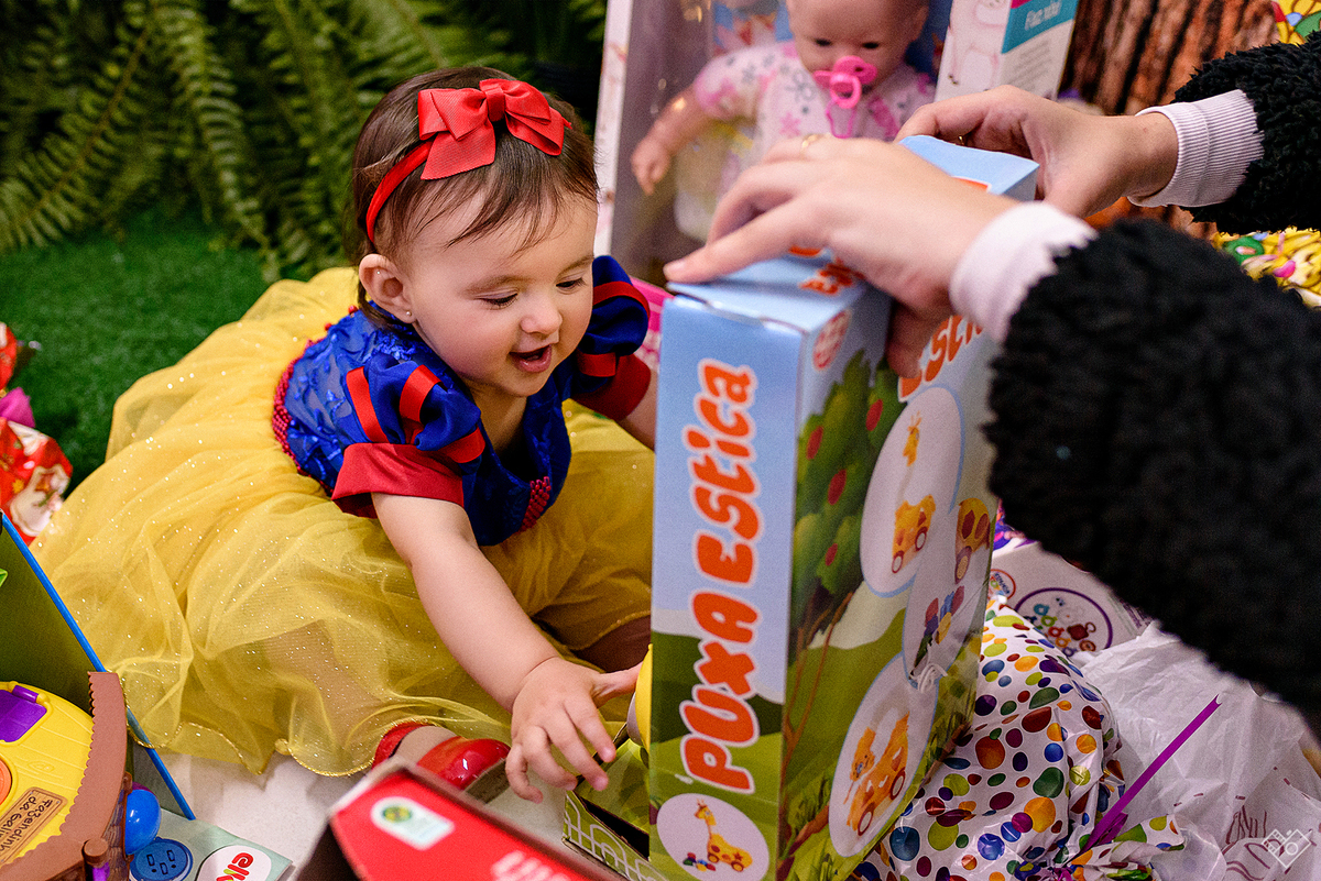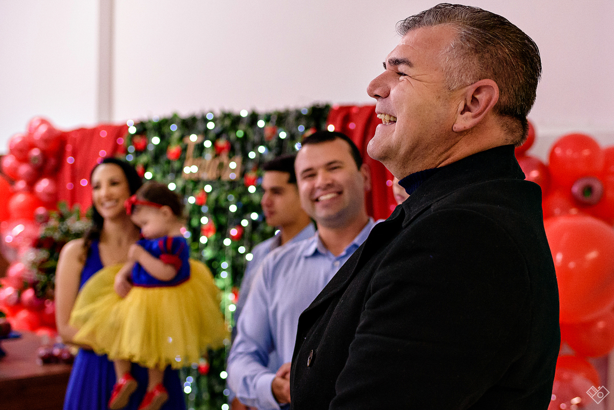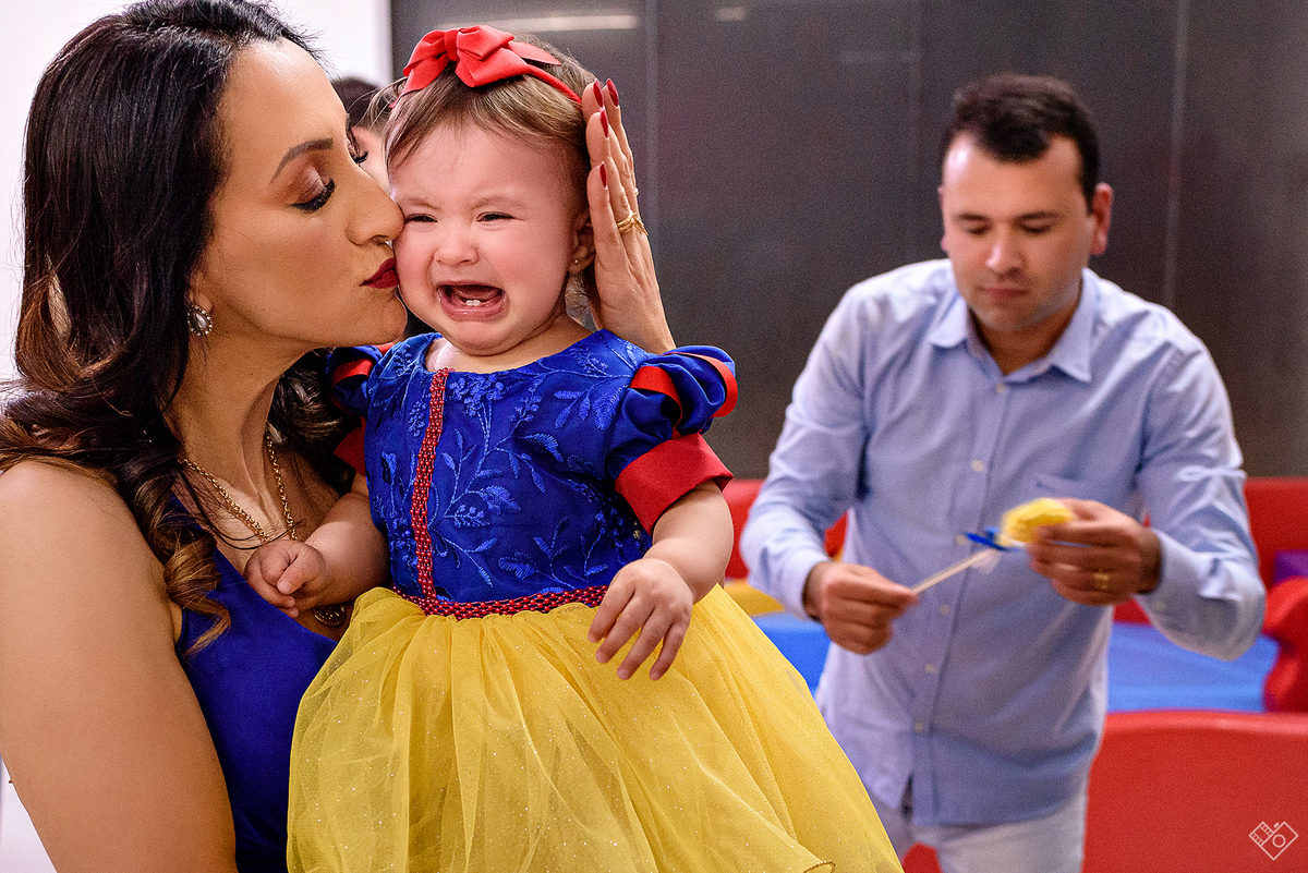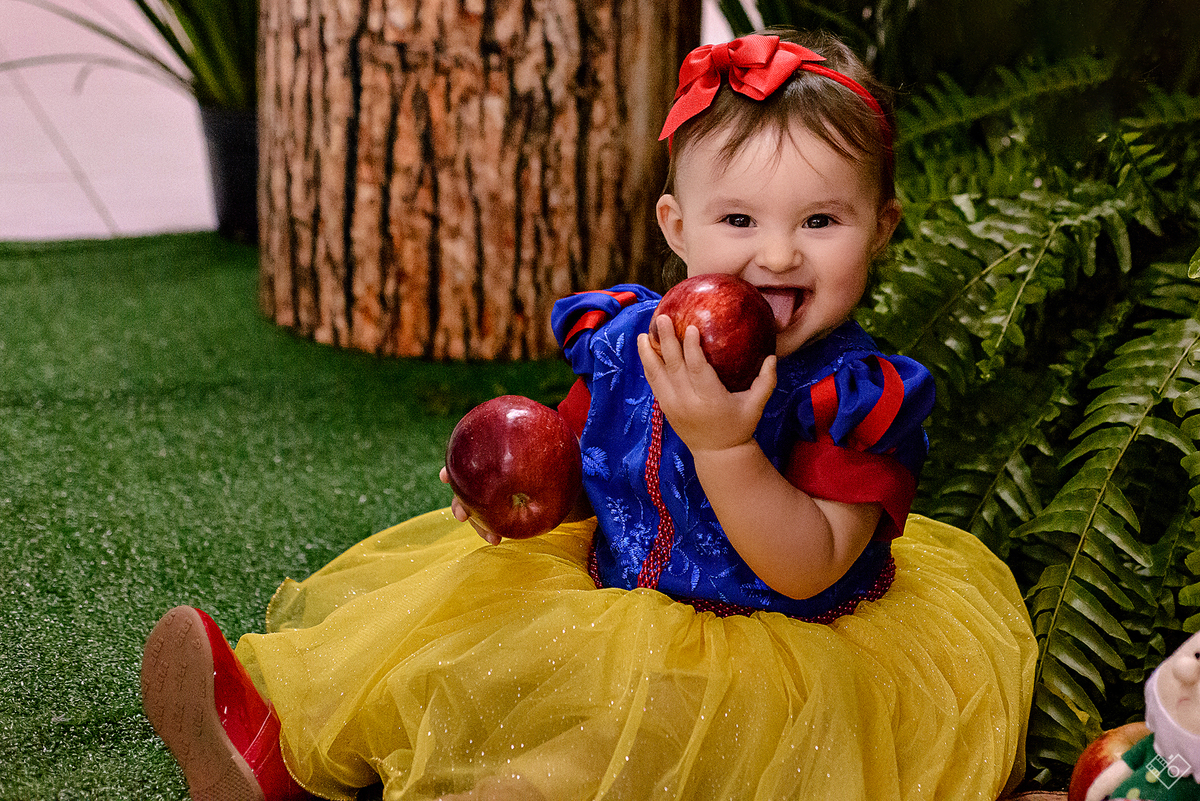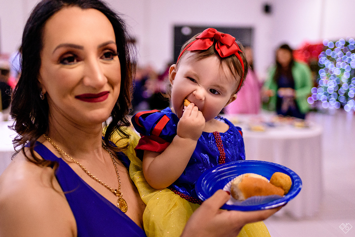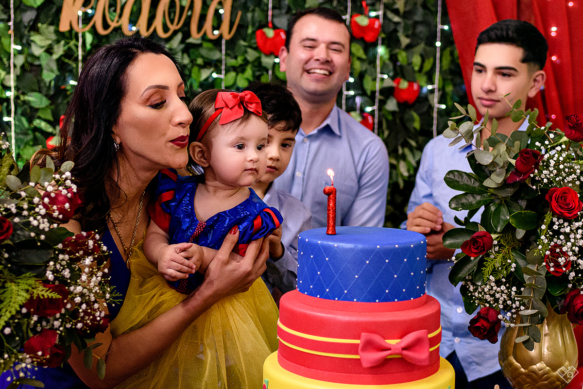 Mas aqui estamos para falar deste primeiro aninho, que festa linda onde a Teodora parecia mais uma princesa vinda dum conto de fadas, aliás, foi com o tema da princesa Branca de Neve que a festa foi pensada e planejada pela mamãe Andrea. Teodora estava feliz, riu e brincou, tirou foto com todos os convidados e sempre abrindo aquele sorriso quando o papai chamava de "linda e perfeita".
