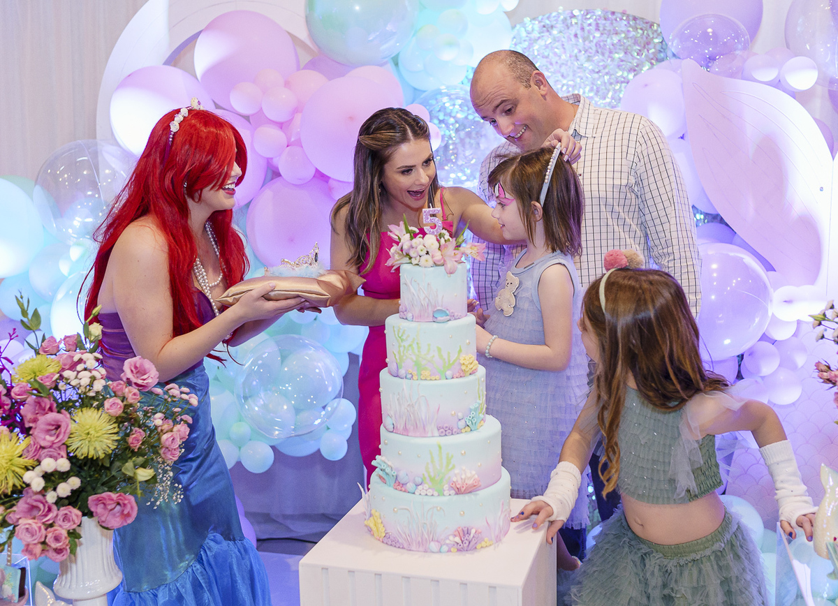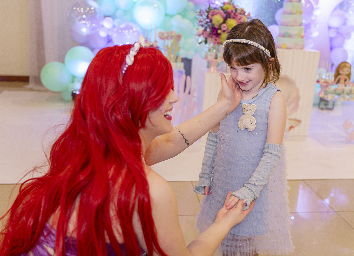 Imagina só: a sereia Ariel estava lá, radiante e cheia de encanto, fazendo desse dia um sonho real para a pequena aniversariante. E como um gesto mágico, Cecília recebeu uma coroa de princesa das mãos da própria Ariel, transformando-se na sereia mais especial deste oceano de amor e alegria.