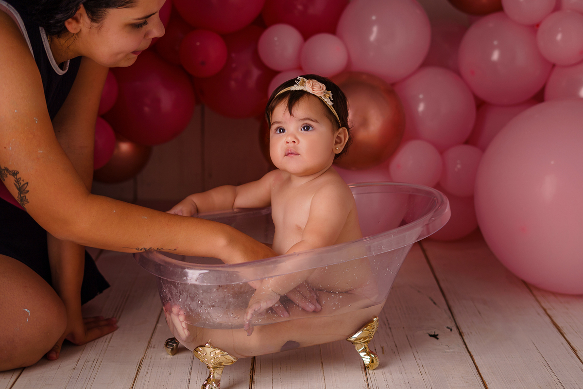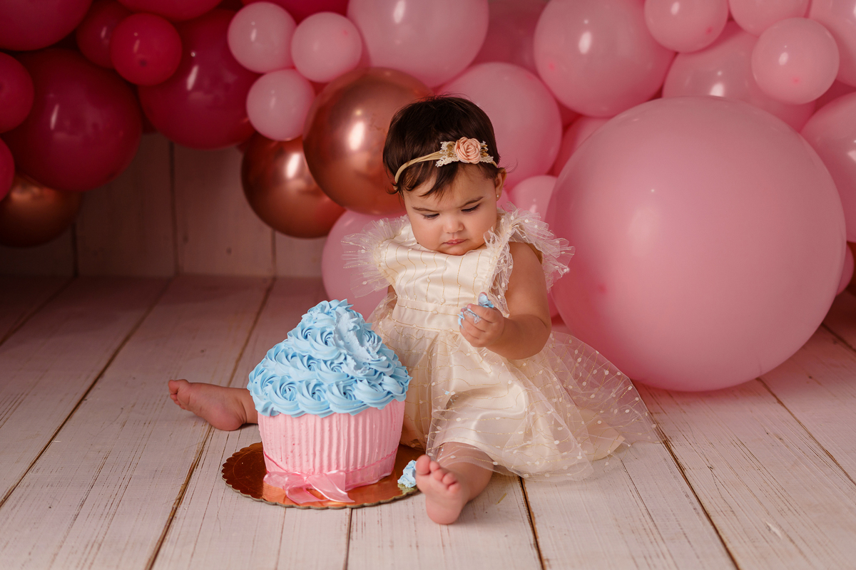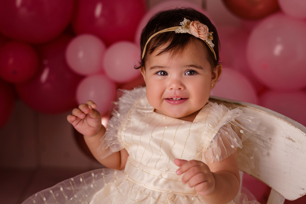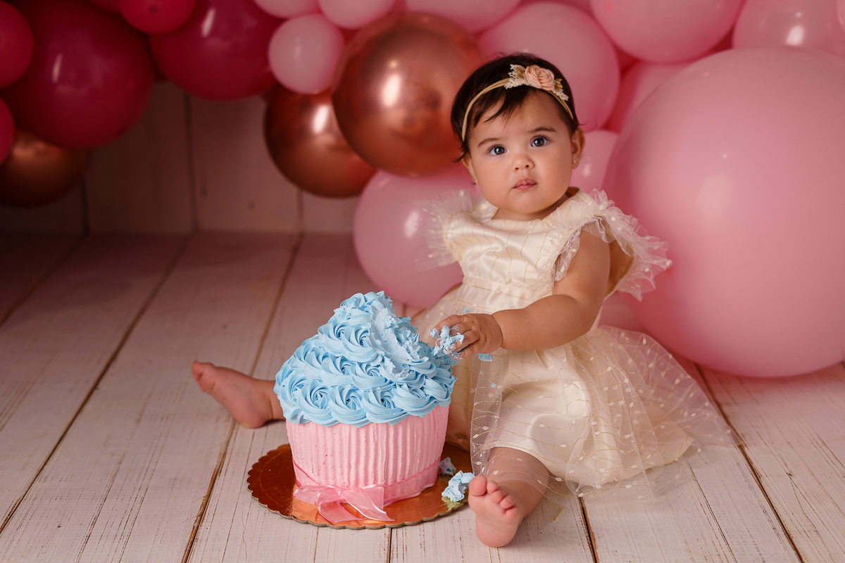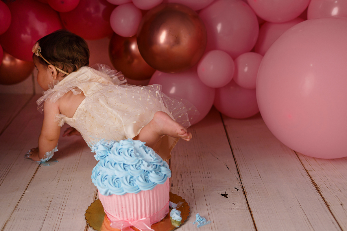 O ensaio Smash the Cake traz um monte de reações lindas de cada bebê e, no caso da Manu, ela fugiu do bolinho... foram muitos sorrisos nas fotos antes e depois mas, apesar dela ter colocado a mão e provado, não curtiu muito o bolo.