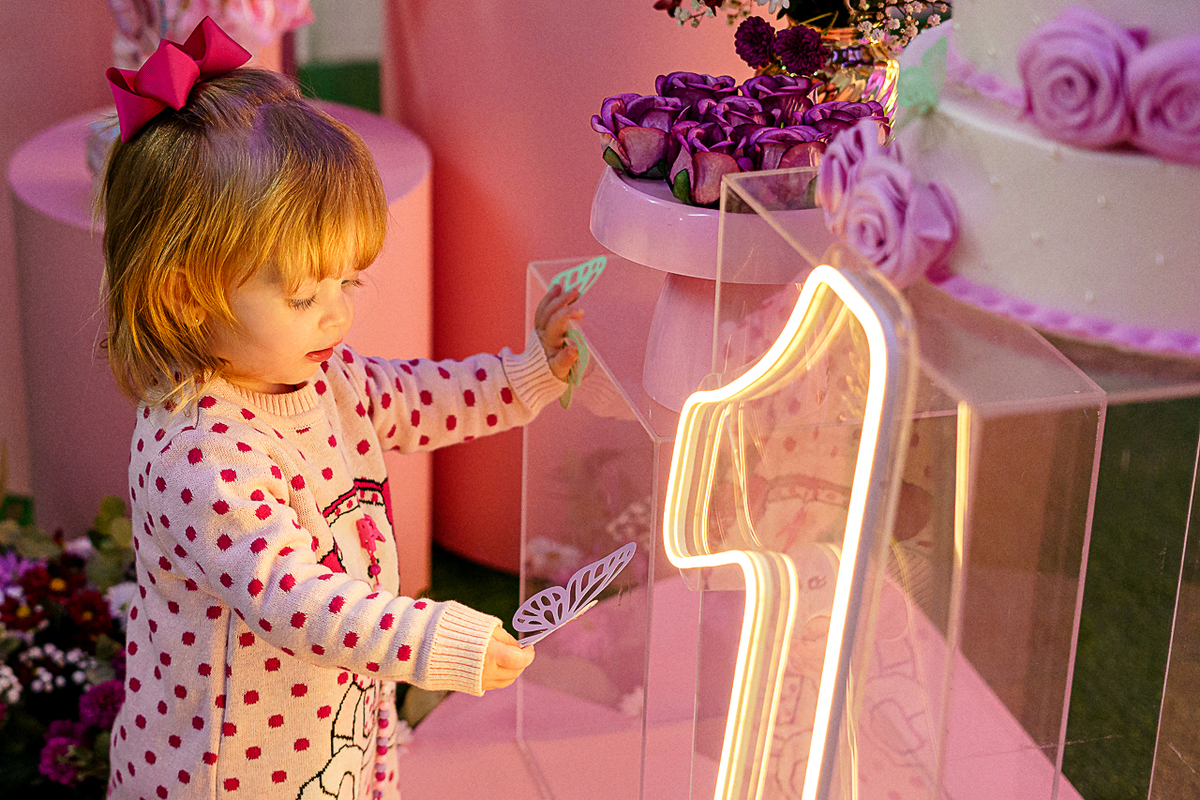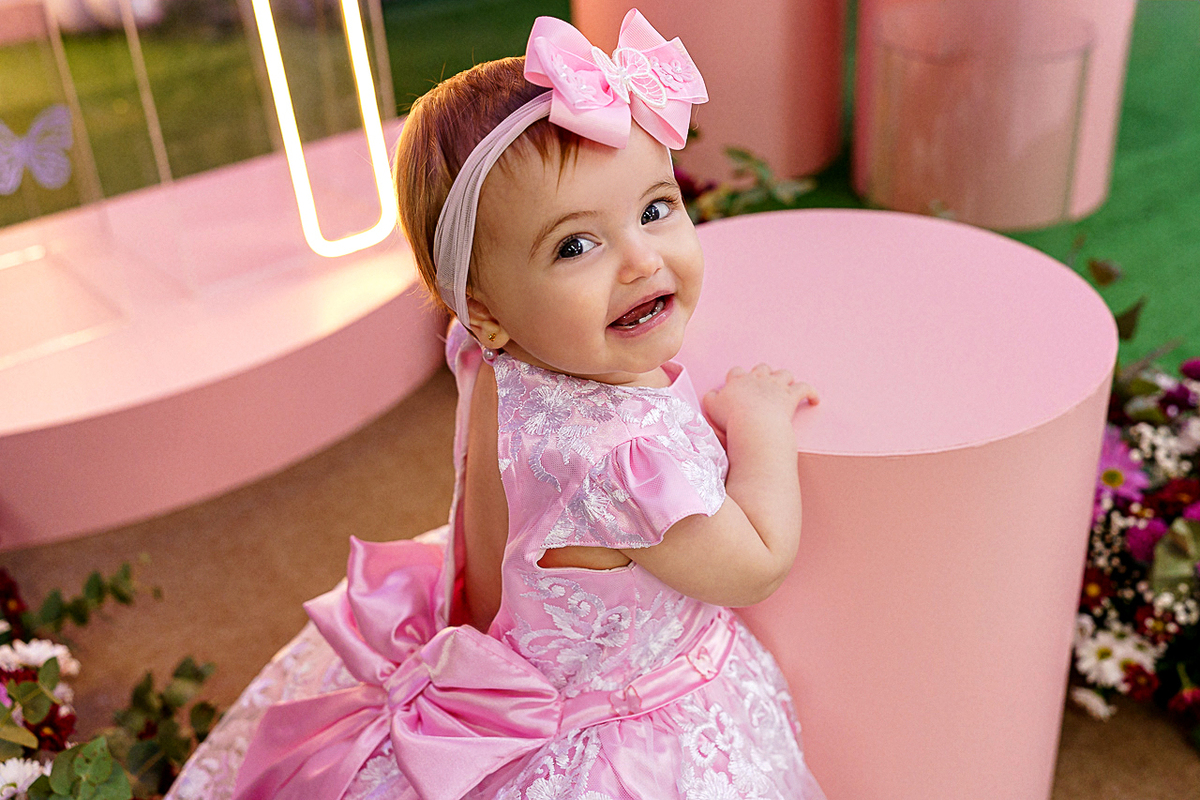 A festa está acontecendo em um jardim encantado, repleto de flores e borboletas coloridas. É uma festa encantadora, cheia de detalhes pensados com muito carinho para comemorar o primeiro aninho da Maya.