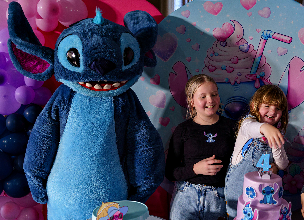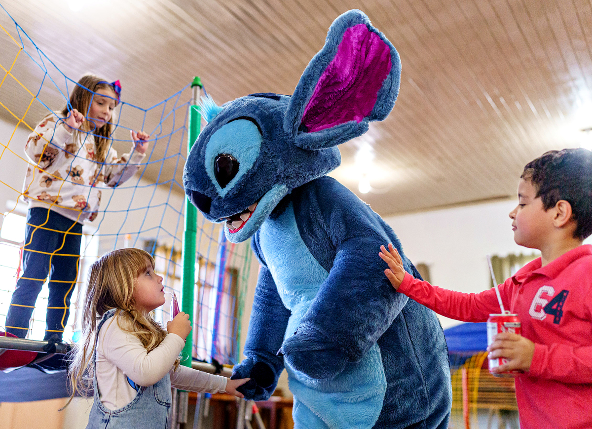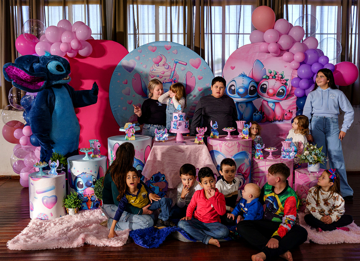A decoração cheia de cores e detalhes encantou a todos, mas foi quando o próprio Stitch apareceu que a festa ganhou ainda mais vida. Cheio de graça, ele fez a alegria das crianças e entrou na brincadeira com toda a energia.